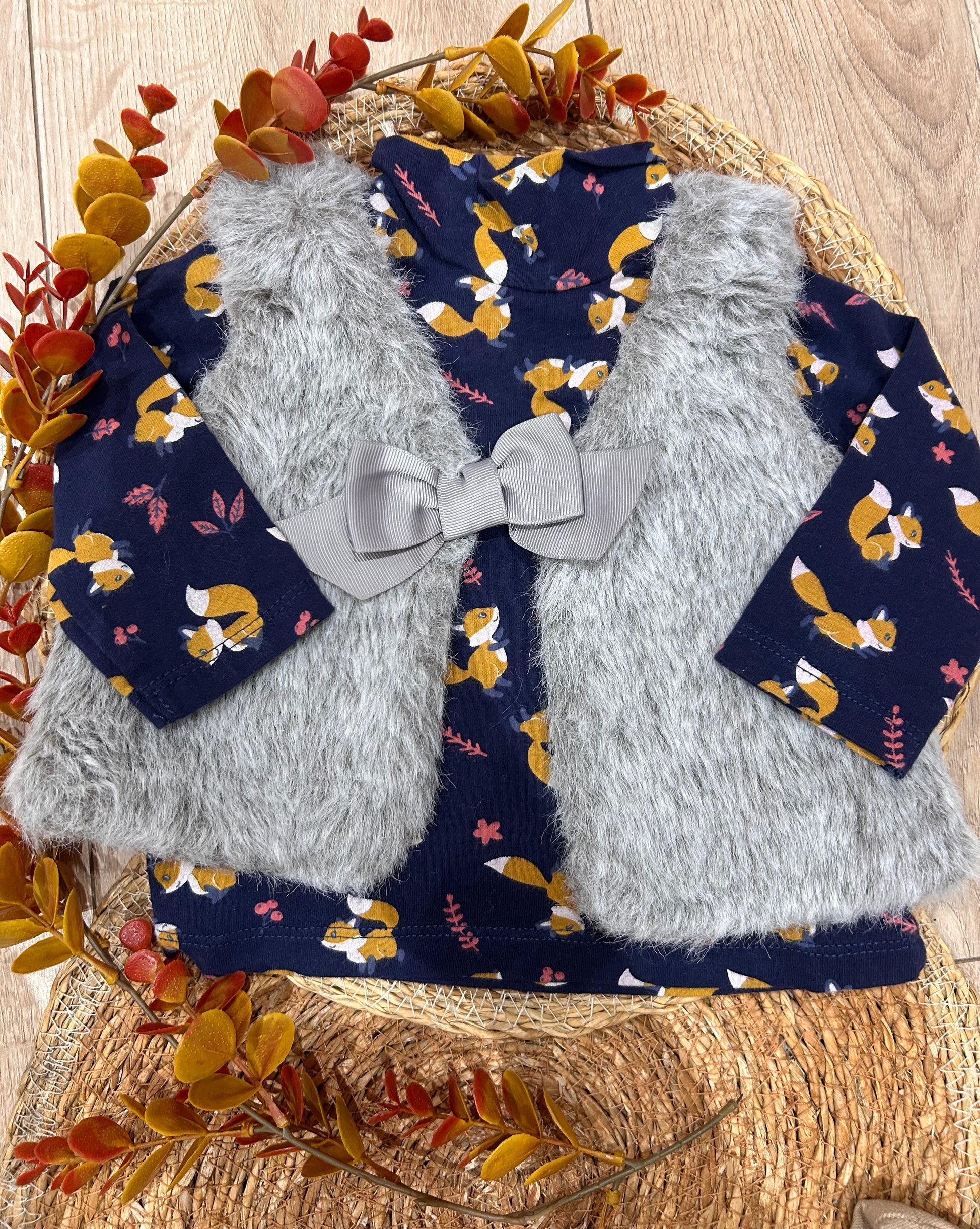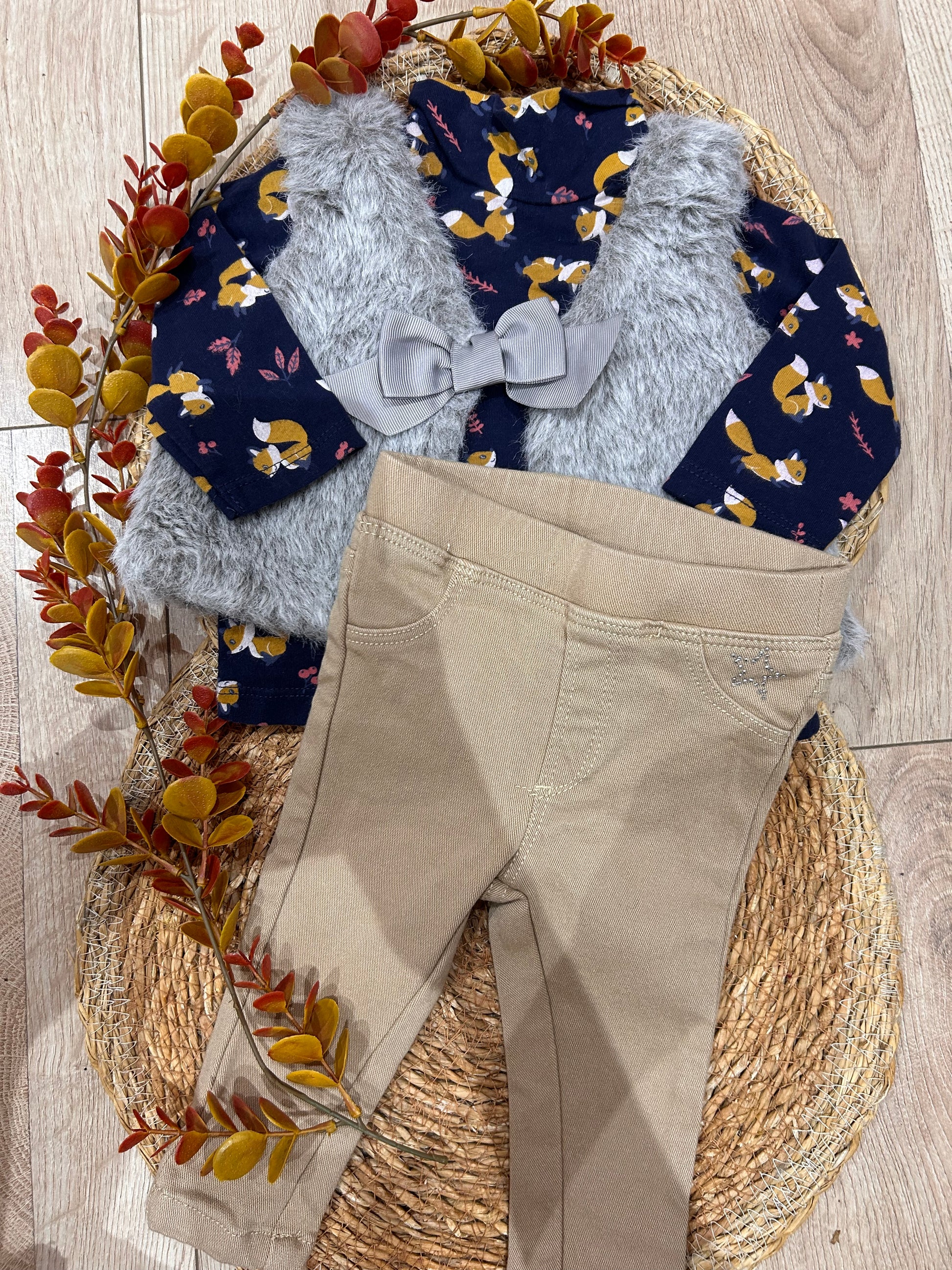 Ensemble 3 pièces composé d’un t-shirt manches longues, d’un gilet sans manches en fourrure & d’un pantalon
