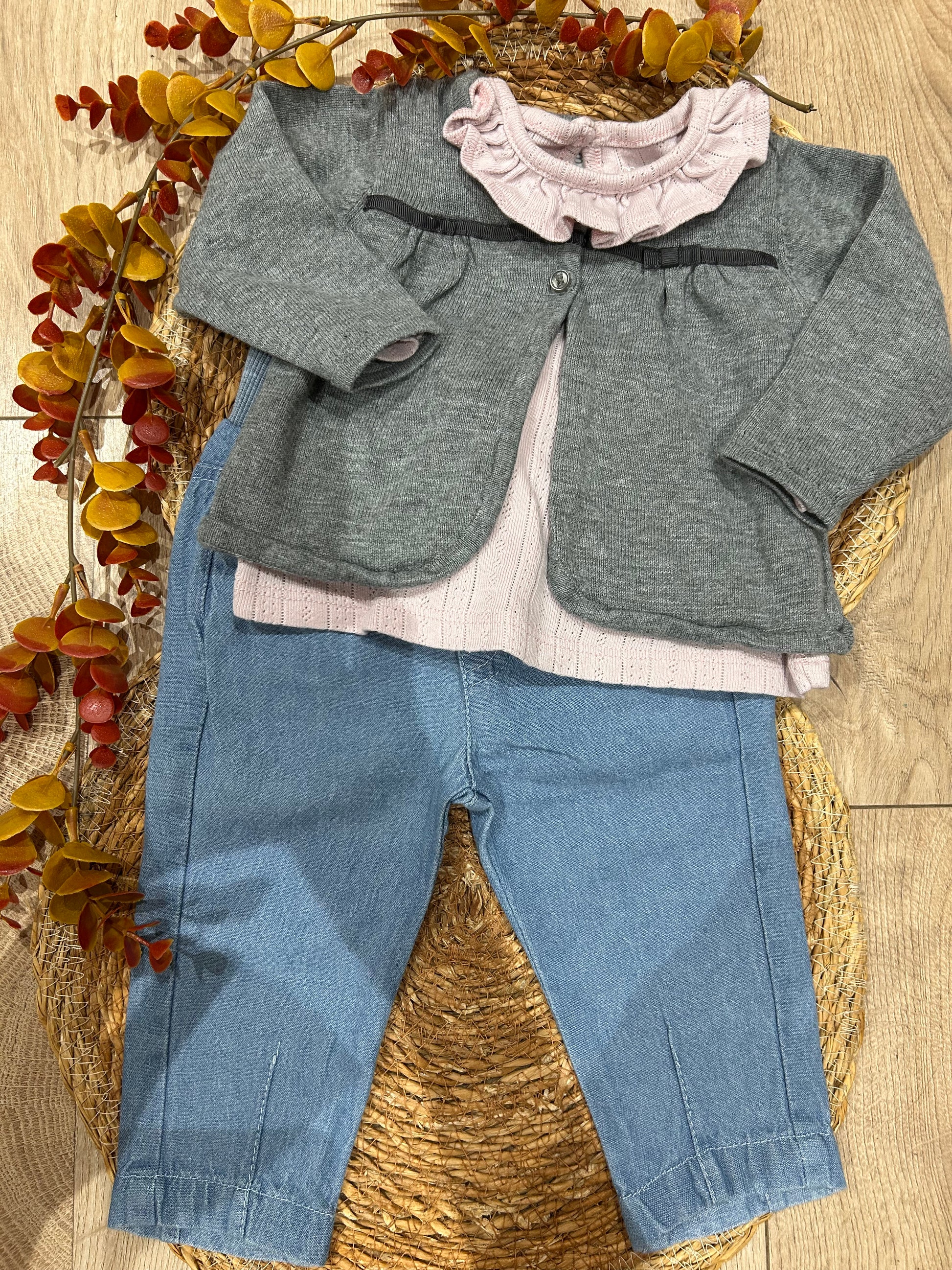 Ensemble 3 pièces composé d’un jean, d’un t-shirt manches longues & d’un gilet